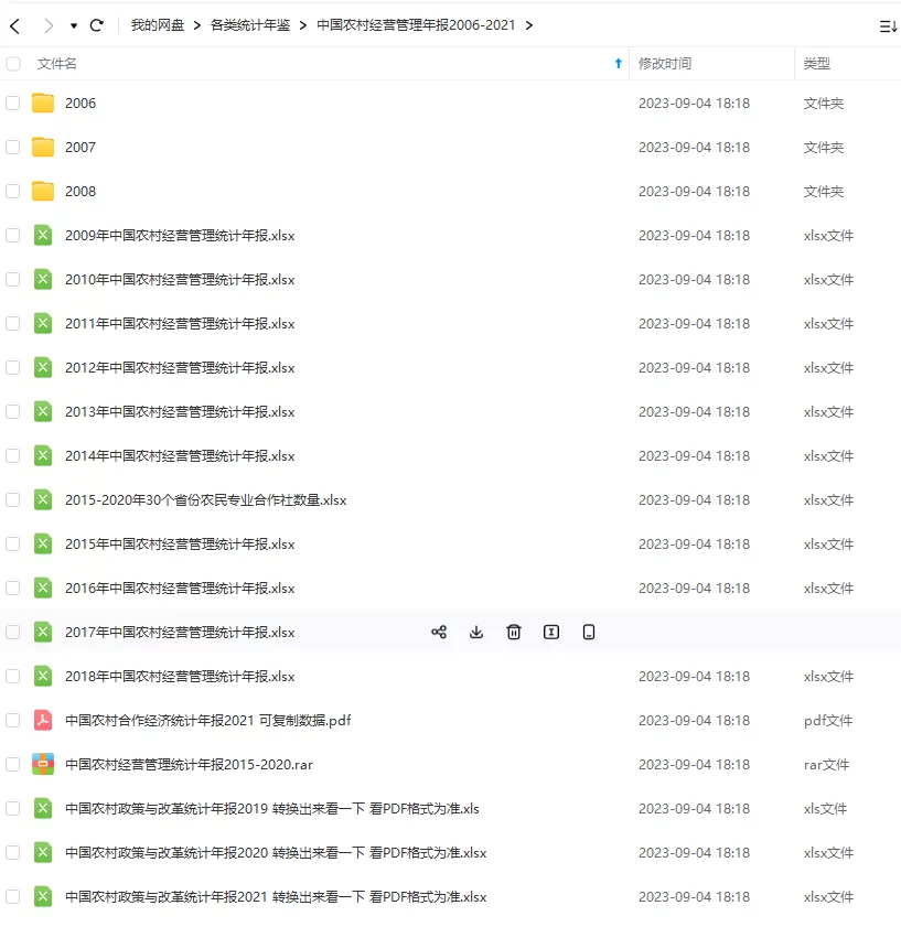 中国农村经营管理统计年报2006-2023含各地区家庭承包经营耕地流转面积家庭农场数量等