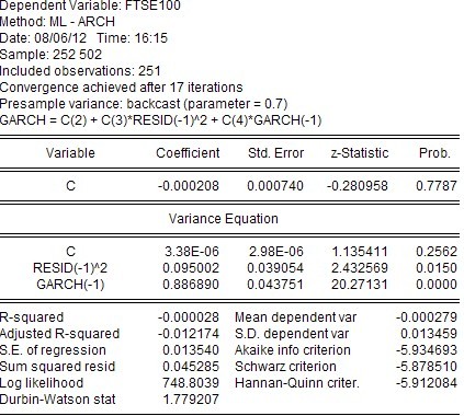 小弟以前从没学过Eviews,但是无奈毕业论文被老师逼着要用,只好硬着头皮来了。我用的是rolling sample的方法,window选择了251,数据从2010年1月4日到2011年12月30日。其中2010年的数据是in-the-sample, 2011年的数据是ouy-the-sample。输入的数据时S(t)/S(t-1) 的Ln值,最后得到了251个conditional variance。但是这个conditional variance需要怎么处理才能得到日波动率呢?我的conditional variance有正有负,不可以开方,而且我好像记得老师说过这个应该要平方才是波动率。我的conditional variance数量级大概是10的-3次方,一平方就会变得特别小,根本没办法进行后面的运算。所以想问一下怎样才能得到日波动率。还有我的GARCH的结果看起来十分的奇怪,我也看得不是很明白,一并贴出来,请高人指点!!!!