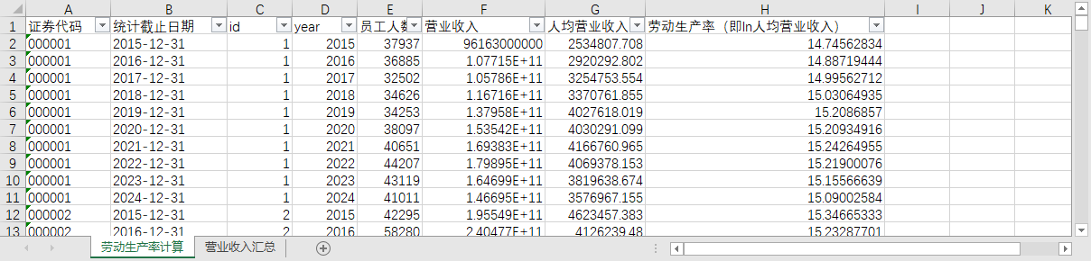 证券代码 统计截止日期 id year 员工人数 营业收入 人均营业收入 劳动生产率(即ln人均营业收入)