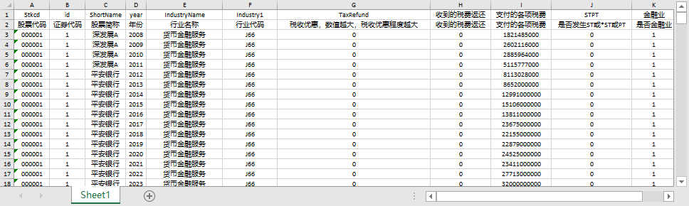 股票代码 证券代码 股票简称 年份 行业名称 行业代码 税收优惠,数值越大,税收优惠程度越大 收到的税费返还 支付的各项税费 是否发生ST或*ST或PT 是否金融业
