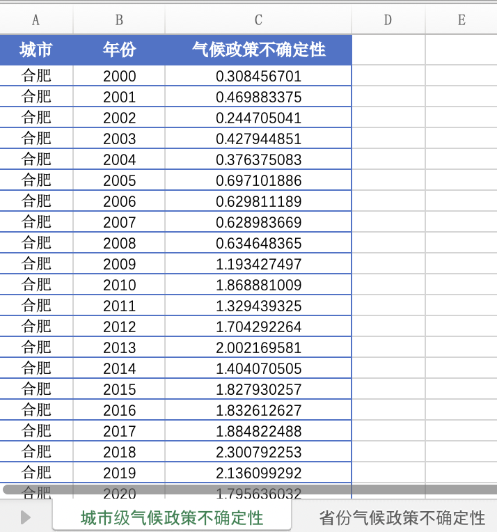 数据背景气候政策不确定性(Climate Policy Uncertainty, CPU)指的是由于气候相关政策的不明确、执行不稳定或反复调整,造成企业或投资者难以预判未来政策走向,从而影响其投资决策、技术研发和市场行为。随着中国应对气候变化行动的不断深化,CPU 在宏观调控、低碳转型和可持续发展中的影响愈发突出,成为研究气候政策有效性及其经济社会影响的重要变量。