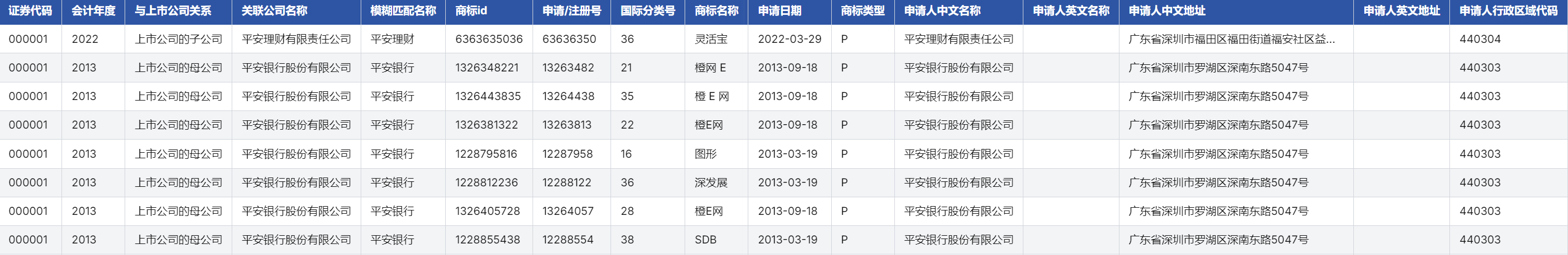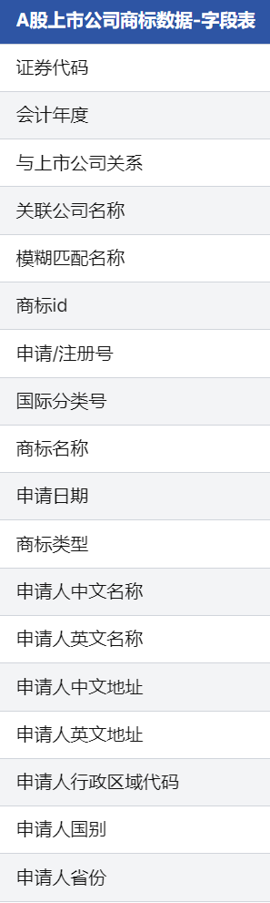 本数据库系统整合2000-2023年中国A股上市公司及其关联主体的商标注册全周期数据,涵盖5,123家不重复公司实体(含上市公司母公司、子公司、联营企业等),匹配国家知识产权局商标数据126万余条[color=rgba(0, 0, 0, 0)]。数据字段覆盖商标基础属性(申请注册号、国际分类号、形态、权利期限)、申请主体信息(行政区域、国别、关联关系)、法律流程节点(初审/注册公告、优先权)及战略标识特征(是否驰名商标、地理标志)等48个维度,通过「上市公司主体-关联公司-商标申请人」三级映射体系,为研究企业品牌战略、知识产权价值评估提供结构化数据支持。