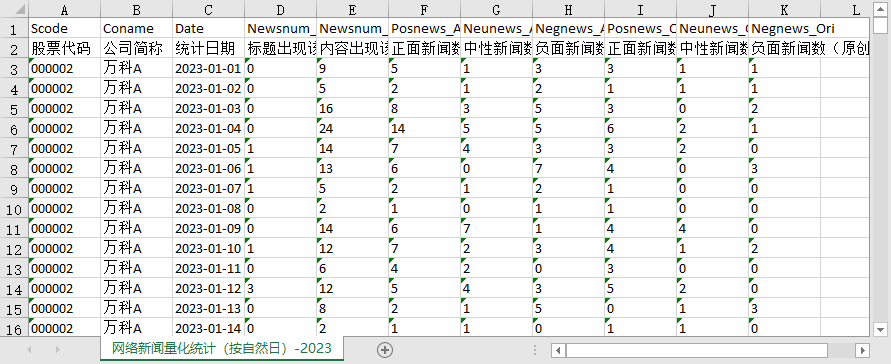 Negnews_All[负面新闻数(全部)]-一天内上市公司全部负面新闻总数,统计时段为0:00-24:00