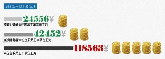 网易财经对117家央企及其上市子公司在岗职工年平均工资进行整理,发现2011年央企及其上市子公司在职员工平均工资为102965元,是去年城镇非私营单位在职员工年平均工资的2.4倍,是城镇私营单位在职员工年平均工资的4.2倍
