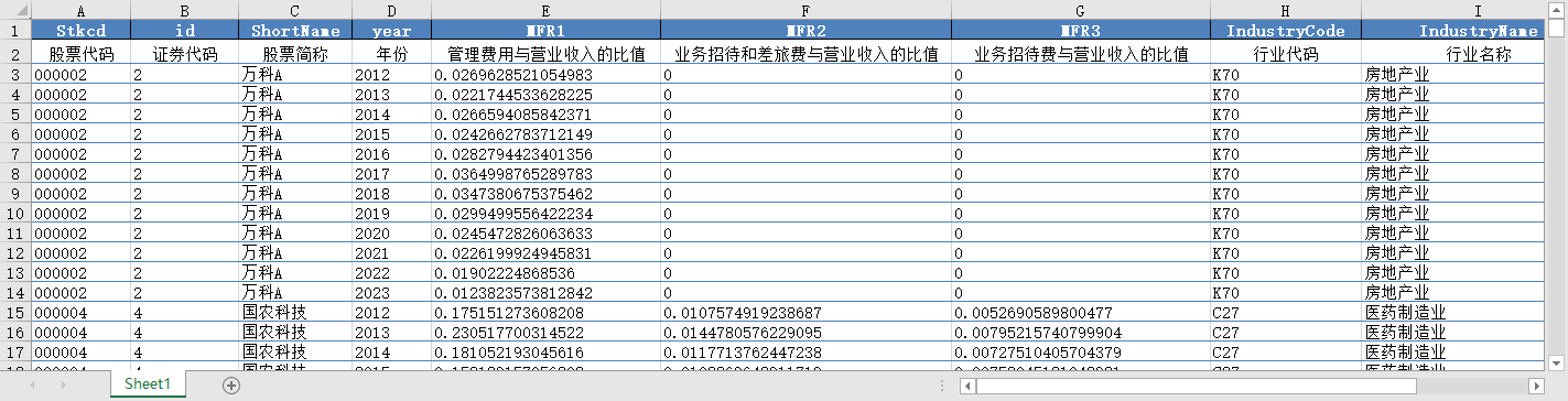 股票代码 证券代码 股票简称 年份 管理费用与营业收入的比值 业务招待和差旅费与营业收入的比值 业务招待费与营业收入的比值 行业代码 行业名称