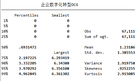 第五步,计算数字化词频总计=括号里这些词频加总(人工智能技术词频、大数据技术词频、云计算技术词频、区块链技术词频、数字技术运用词频)。企业数字化转型DCG为年报中涉数字化关键词的词数加1取自然对数,即数字化转型DCG=in(数字化词频总计+1);人工智能技术AI为年报中涉及人工智能技术关键词的词数加1取自然对数,即人工智能技术AI=ln(1+人工智能技术词频);区块链技术BD为年报中涉及区块链技术关键词的词数加1取自然对数,即区块链技术BD=ln(1+区块链技术词频);云计算技术CC为年报中涉及云计算技术关键词的词数加1取自然对数,即云计算技术CC=ln(1+云计算技术词频);大数据技术DT为年报中涉及大数据技术关键词的词数加1取自然对数,即大数据技术DT=ln(1+大数据技术词频);数字技术应用ADT为年报中涉及数字技术应用关键词的词数加1取自然对数,即数字技术应用ADT=ln(1+数字技术运用词频)。