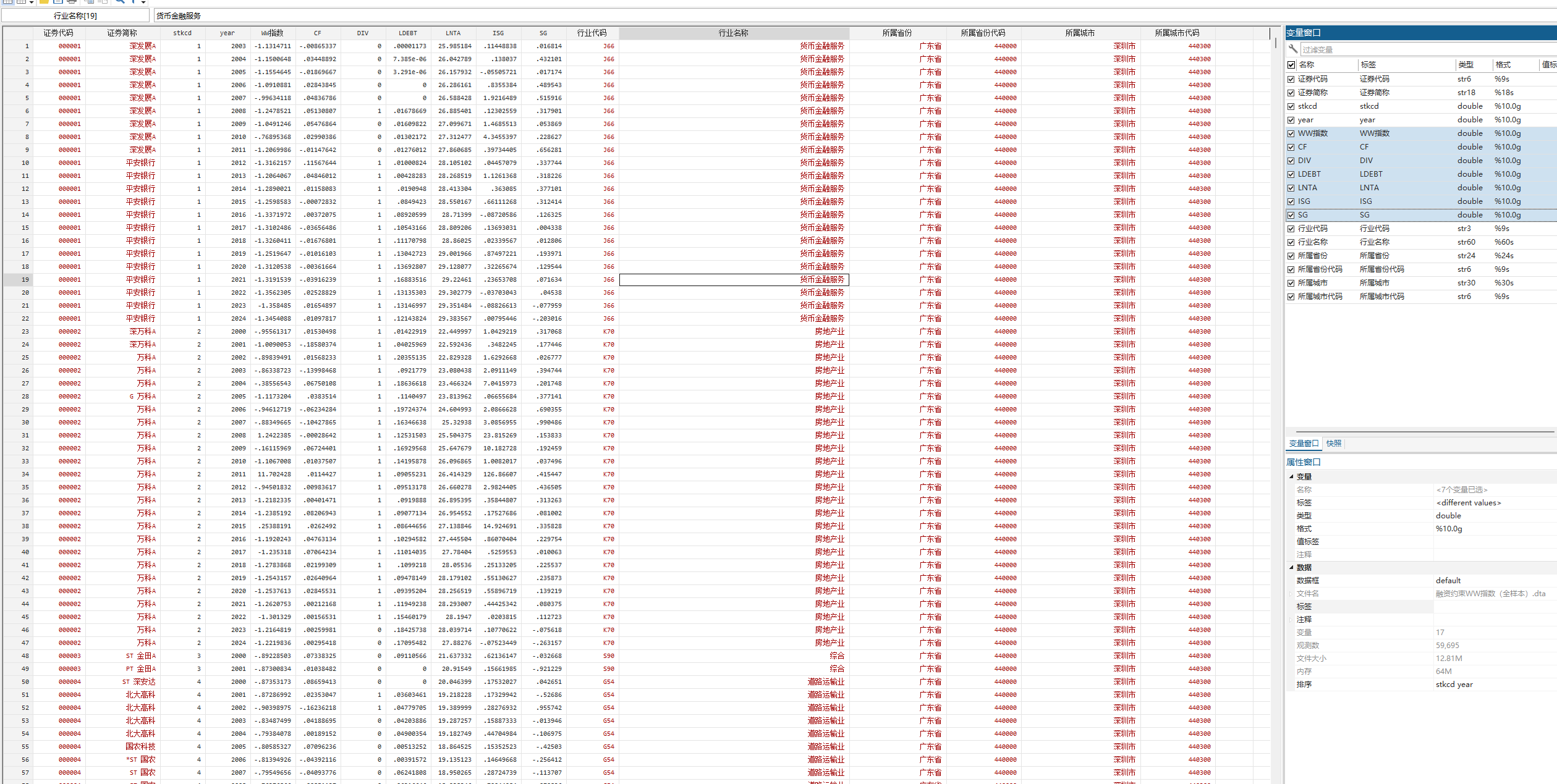 指标说明:参考文献计算WW指数=-0.091×CF-0.062×DIV+0.021×LDEBT-0.044×LNTA+0.102×ISG-0.035×SG。其中,CF=经营性净现金流/总资产;DIV=是否支付现金股利;LDEBT=长期负债/总资产;LNTA=ln(总资产);SG为销售收入增长率;ISG为按年度计算的各行业平均销售收入增长率,行业按照2012证监会行业分类标准,制造业取两位编码,其他行业取一位编码。