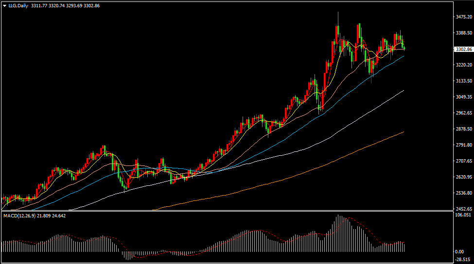 从黄金日线图看,金价连续二日下跌回落,金价跌破5日和10日均线,目前金价回落在30日均线(金价3302美元)附近振荡运行。