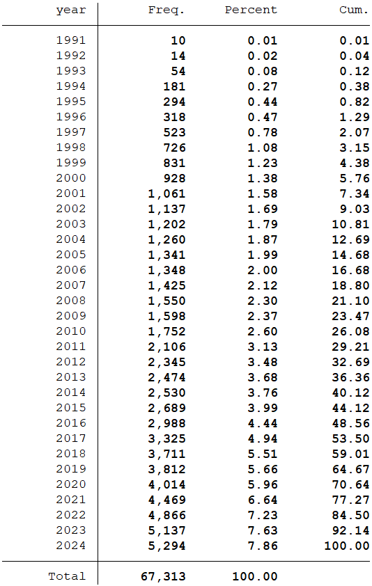 样本选择:全部A股1991-2024年数据(初始数据是从1990年开始,经过处理后的数据起点为1991年)