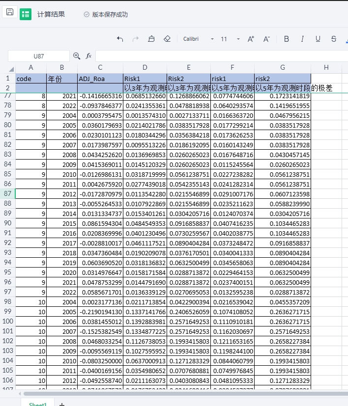 二、处理说明:参考Johnetal.(2008)、余明桂等(2013)的研究,将公司Roa减去年度行业均值得到Adi_Roa,以缓解行业及周期的影响。由于中国制造业上市公司数量较多,观测值超过全样本的70%,因此对制造业企业的行业分类细化至两位代码,并删除行业仅有一家公司的样本。以每三年(t年至+2年)作为一个观测时段,分别滚动计算经行业调整后的Roa(AdjRoa)的标准差和极差,同时参考Faccioet al.(2011)和宋建波等(2017)的处理方式,将该结果乘以100得到Risk1和Risk2两个指标以衡量企业风险承担水平,对于量纲的处理能够使结果更加直观,并不影响其显著性水平。本数据分别以3年、5年作为一个观测段,计算ROA的极差和标准差。