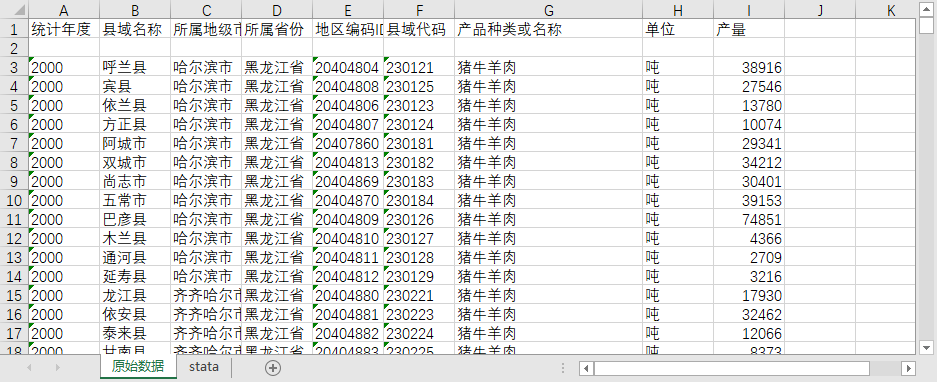 | 统计年度 | 县域名称 | 所属地级市 | 所属省份 | 地区编码ID | 县域代码 | 产品种类或名称 | 单位 | 产量 |