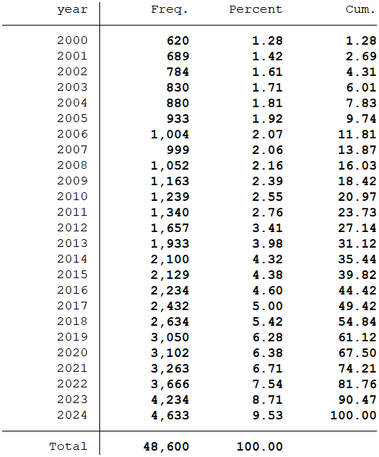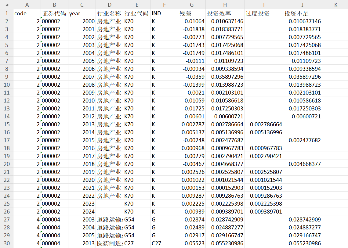样本选择:全部A股2000-2024年数据(初始数据是从1990年开始,回归选择的数据起点为2000年,可自行在代码中更改时间范围)