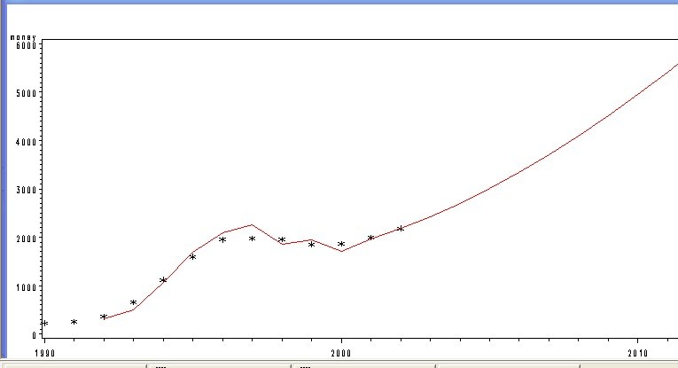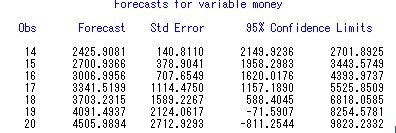 今天用SAS拟合一组13个数据并预测以后的7个数据,拟合及预测的值如下: