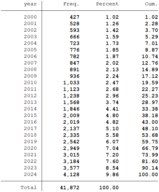 样本选择:全部A股2000-2024年数据(“经营活动产生的现金流量净额”数据是从1998年开始,所以数据起点选择为1998年,经过处理之后的数据起点为2000年)