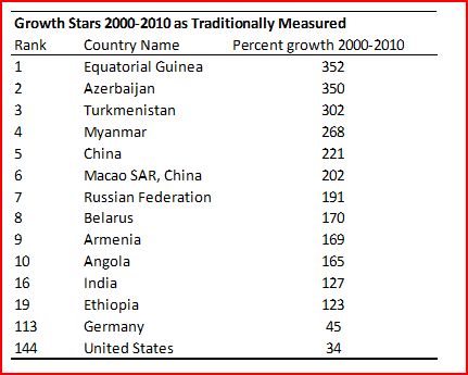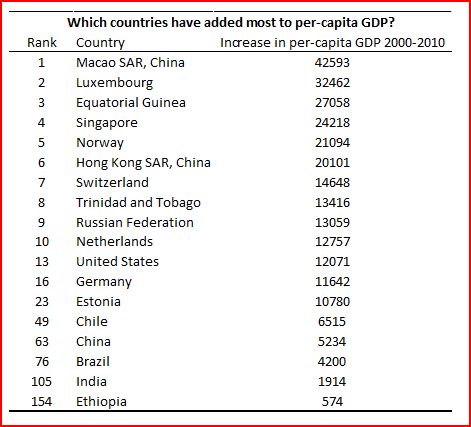 When we talk about growth, we typically focus on growth rates, and so if we were to look at which countries had the greatest percentage increase in GDP per capita over the last decade (at constant international prices according to the World Development Indicators), we would get a table like this: