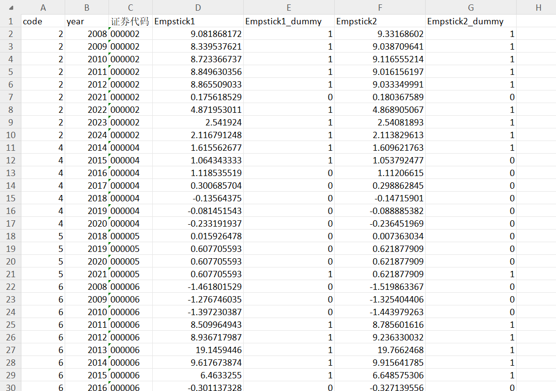 以广义上的高管(董事监事和高管)计算高管薪酬总额,从而得到的结果对应 员工薪酬粘性(Empstick2)和员工薪酬粘性虚拟变量(Empstick2_dummy)。