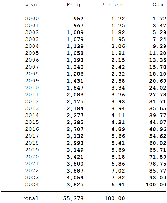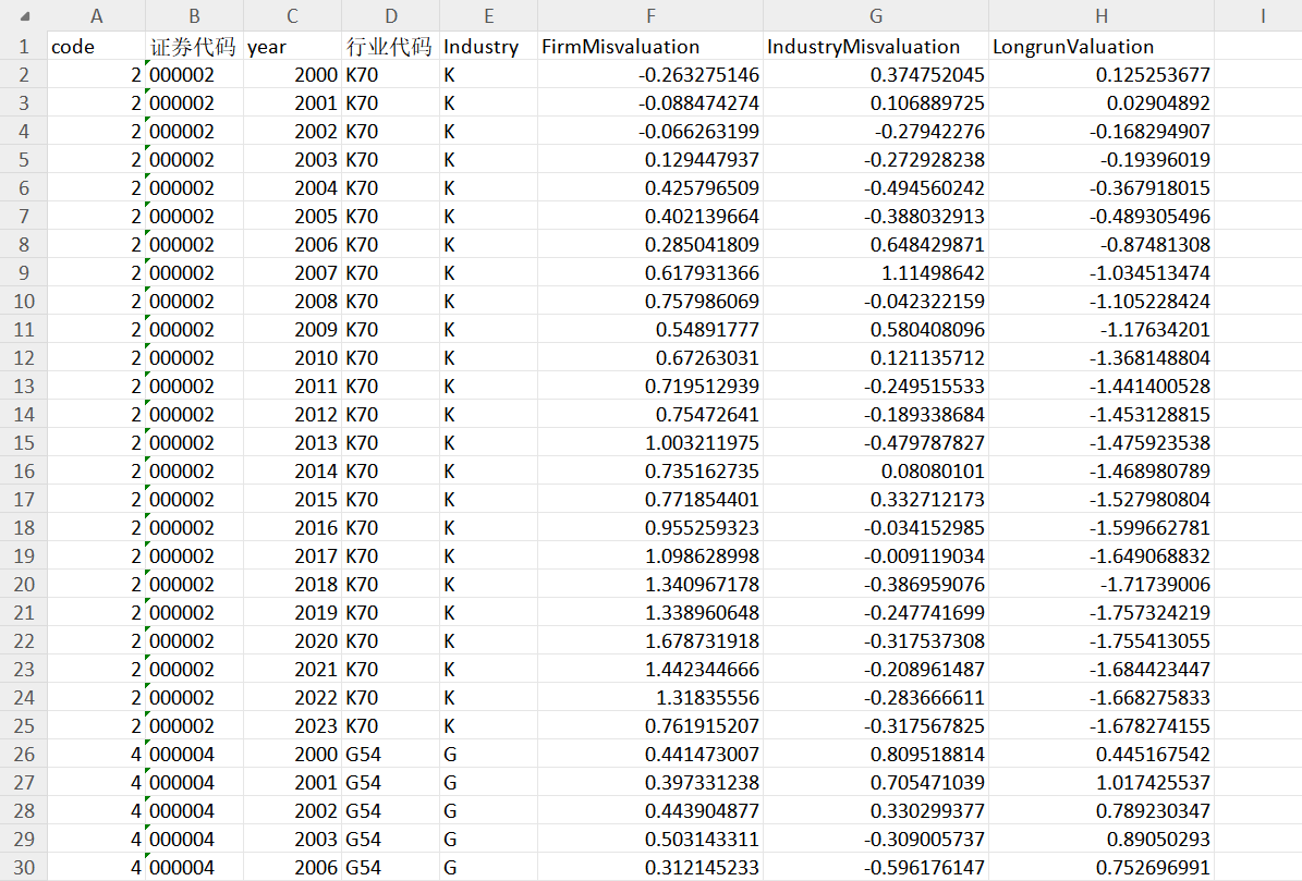 样本选择:全部A股2000-2024年数据(初始数据是从1990年开始,选取数据处理的起点为2000年,可自行更改数据计算区间)
