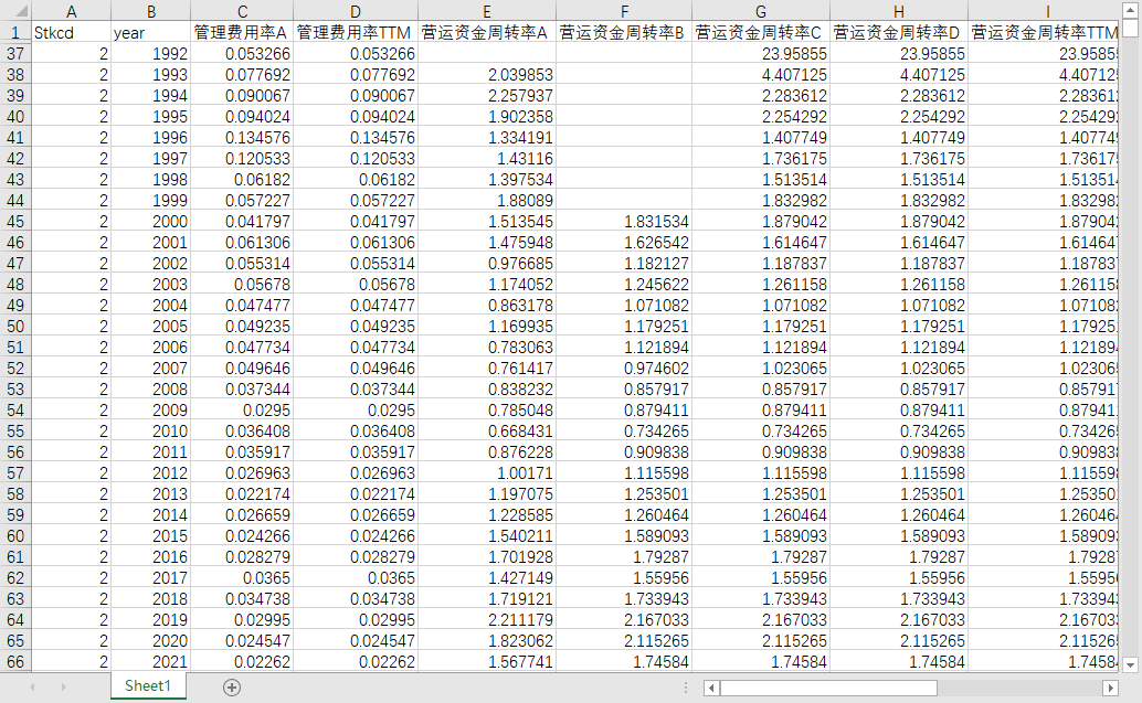 Stkcd year 管理费用率A 管理费用率TTM 营运资金周转率A 营运资金周转率B 营运资金周转率C 营运资金周转率D 营运资金周转率TTM 总资产周转率A 总资产周转率B 总资产周转率C 总资产周转率D 总资产周转率TTM