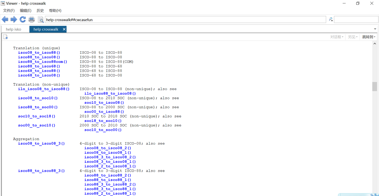 [size=1.1em]crosswalk命令是瑞士伯尔尼大学社会学教授Ben Jann开发的Stata命令 (estout输出表格指令也是其开发的 )。根据help文件,crosswalk可以实现ISCO不同年份编码之间的转换,以及ISCO与ISEI/SIOPS/EGP等社会地位测量之间的变换。同时,crosswalk命令还可以实现自定义转换列表和命令,省去上述修改和调试ado文件的繁琐过程。