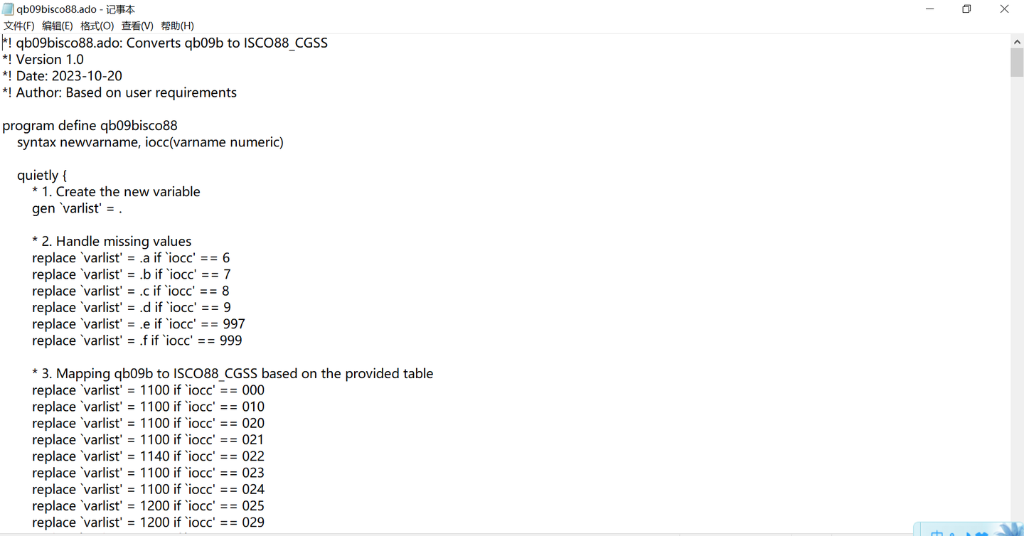 用记事本打开 iscoocc文件可以发现,该命令实质是依据转换表对不同职业代码值进行替换。需注意的是,iscoocc命令适用于将2009年版国家职业代码(CSCO09)转换为ISCO88。由于现行最新国家职业代码为2015年发布的版本 ,因此使用前需先确认调查数据中采用的国标代码年份。具体可查阅调查项目组的手册,或通过职业编码内容进行核查。GB/T 6565-2015征求意见稿中列出09和15年对照表 ,因此可以参照该表进行转换。正式版本的标准需要购买,只提供pdf文件 ,在转换前可以核查一下是否存在差异。