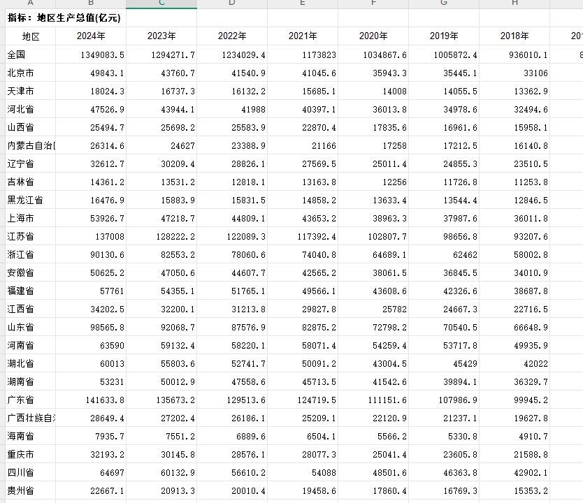 1992-2024年全国及各省国内生产总值、第一产业增加值、第二产业增加值、第三产业增加值数据(无缺失)