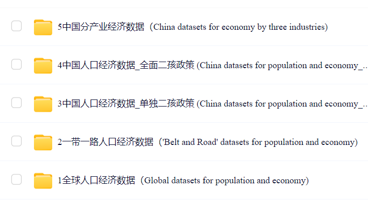 5种共享社会经济路径(SSPs)人口和经济预估数据库南信大姜彤教授研究团队发布了5种共享社会经济路径(SSPs)下的人口与经济预估数据库。该数据库包含 2010-2100年中国、“一带一路”区域和全球范围内分年龄、性别和教育水平的人口以及分三次产业的GDP数据,数据分辨率为0.5°×0.5°。共享社会经济路径(SSPs)是政府间气候变化专门委员会(IPCC)于2010年推出的描述全球社会经济发展情景的有力工具,该情景在典型浓度路径(RCPs)情景基础上发展而来,用于定量描述气候变化与社会经济发展路径之间的关系,反映未来社会面临的气候变化适应和减缓挑战。研究团队采用改进的人口-发展-环境(PDE)模型和柯布‒道格拉斯(Cobb-Douglas)模型,通过历史时期生育率、死亡率、迁移率、教育水平等,以及资本存量、全要素生产率、劳动力水平等率定和验证了人口和经济模型参数,在全球SSPs框架下,开展了SSP1~SSP5下2020—2100年中国分城乡的人口和分产业的经济预估,并构建了最新的“一带一路”沿线国家和全球人口和经济预估数据。为了科学支撑IPCC第五次评估报告、国际耦合模式比较计划第五阶段(CMIP5)和部门间影响模式国际比较计划(ISI-MIP),促进气候变化科学基础、影响和风险、适应和减缓的发展,IPCC第二和第三工作组的科学家于2010年承担了SSPs情景的设计研究。SSPs情景既要反映全球和区域发展现状和未来可能的发展变化,又要反映未来社会面临的气候变化适应和减缓挑战。每一个SSPs情景需要涵盖人口和人力资源、经济发展、生活方式、人类发展、环境与自然资源、政策和体制、技术发展等7个方面内容。SSPs情景设计了可持续发展路径(SSP1)、中间路径(SSP2)、区域竞争路径(SSP3)、不均衡路径(SSP4)、以传统化石燃料为主的路径(SSP5)等5种社会经济发展路径。人口和经济是SSPs情景设计中最重要的基础,也是最为关键的要素(图1)。人口和经济变化数据可以用来驱动综合评估模型(IAM),模拟和预估与SSPs相关的土地利用、能源和碳排放变化过程和发展趋势。目前,SSPs情景已经广泛用于CMIP6和ISI-MIP 3b等国际计划和2021—2022年发布的IPCC第六次评估报告,以及气候变化对自然、人类和管理系统的影响和关键风险评估,促进了气候变化科学基础、影响、风险、适应和减缓研究。数据集文件包括:中国(单独二孩):SSPs_GDP_CHNT_v1.xlsx:单独二孩政策下GDP预测数据SSPs_POP_CHNT_v1.xlsx:单独二孩政策下人口预测数据SSPs_POP_R_CHNT_v1.xlsx:单独二孩政策下农村人口预测数据SSPs_POP_U_CHNT_v1.xlsx:单独二孩政策下城市人口预测数据数据格式:3826(中国格点数)×91(年份)×5(SSPs)格点分辨率:0.5°×0.5°时间尺度:2010-2100年GDP单位:亿元人民币(2010年价格)人口单位:人中国(全面二孩):SSPs_GDP_CHNF_v1.xlsx:全面二孩政策下GDP预测数据SSPs_POP_CHNF_v1.xlsx:全面二孩政策下人口预测数据SSPs_POP_R_CHNF_v1.xlsx:全面二孩政策下农村人口预测数据SSPs_POP_U_CHNF_v1.xlsx:全面二孩政策下城市人口预测数据POP_Prov:全面二孩政策下分省人口预测数据GDP_Prov:全面二孩政策下分省GDP预测数据数据格式:3826(中国格点数)×91(年份)×5(SSPs)格点分辨率:0.5°×0.5°时间尺度:2010-2100年GDP单位:亿元人民币(2010年价格)人口单位:人“一带一路”:gdp_B&R_**_v1.xlsx:“一带一路”GDP预测数据pop_B&R_**_v1.xlsx:“一带一路”总人口预测数据pop_r_B&R_**_v1.xlsx:“一带一路”农村人口预测数据pop_u_B&R_**_v1.xlsx:“一带一路”城市人口预测数据包括“一带一路”沿线中国在内65个国家数据格式:27578(格点数)×91(年份)×5(SSPs)格点分辨率为0.5°*0.5°时间尺度:2010-2100年GDP单位:十亿美元(2010年价格,PPP)人口单位:百万人全球:gdp_world_**_v1_v1.xlsx:全球GDP预测数据pop_world_**_v1_v1.xlsx:全球总人口预测数据pop_r_world_**_v1_v1.xlsx:全球农村人口预测数据pop_u_world_**_v1_v1.xlsx:全球城市人口预测数据数据格式为68542(格点数)×91(年份)×5(SSPs)格点分辨率为0.5°*0.5°时间尺度:2010-2100年GDP单位为十亿美元(2010年价格,PPP)人口单位为百万人中国三产产值:中国三产产值数据以压缩文件格式提供primary_industry_**_v1.zip:第一产业增加值secondary_industry_**_v1.zip:第二产业增加值tertiary_industry_**_v1.zip:第三产业增加值每个压缩文件中包含逐年预估结果,以ASCII的栅格格式输出格点分辨率为5’*5’时间尺度:2020-2100年单位:百万元人民币