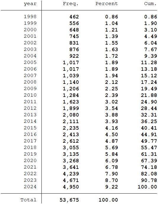 样本选择:全部A股1998-2024年数据(“经营活动产生的现金流量净额”数据是从1998年开始,所以数据起点选择为1998年)。其中,模型1.1.7和1.1.8较为特殊,计算结果均为1999-2023年。