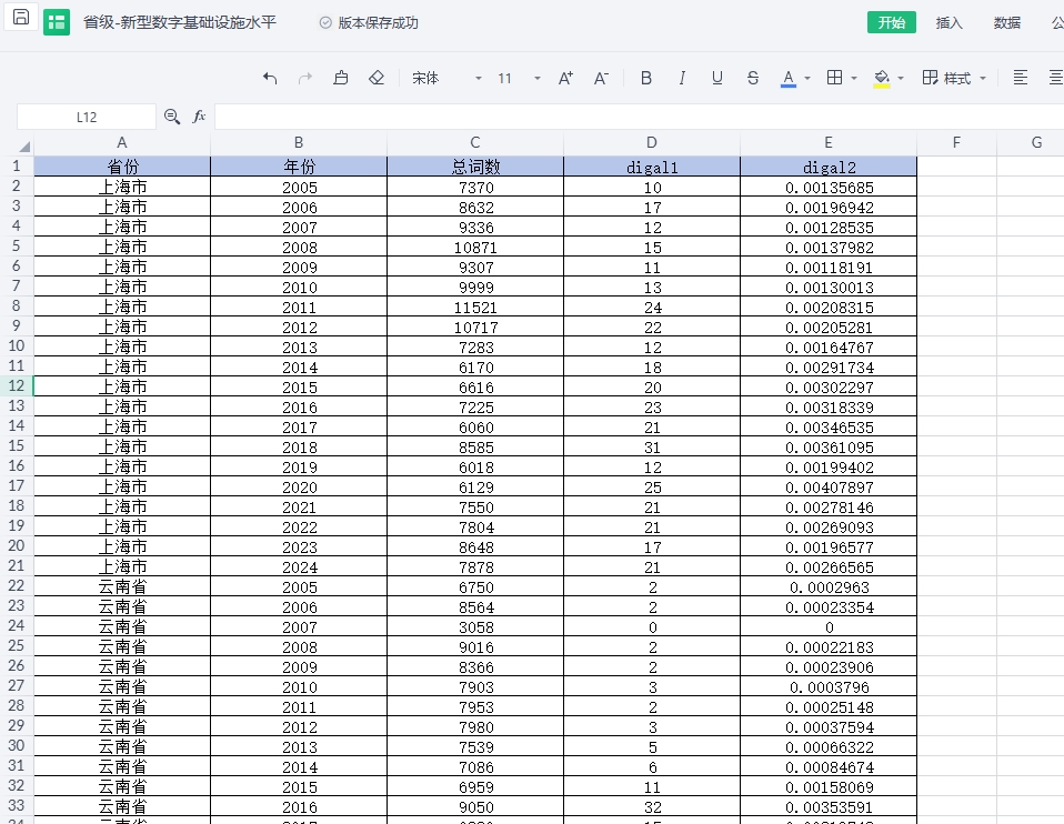 包含指标:省份 年份 总词数 G 移动通信 信息技术 信息经济 信息基础设施 大数据 数据化 数字产业 数字基础设施 云计算 互联网 物联网 人工智能 机器人 智能制造 智能装备 智能经济 智能工厂 数据中心 智慧城市 云服务 云技术 虚拟化 云应用 云平台 区块链 智能终端 云端 电子政务 互联网金融 移动支付 互联网化 电子商务 线上 电商 信息服务 无人驾驶 智能技术 网络技术 软件技术 信息科技 通信技术 电子技术 计算机技术 网络科技 软件 智能科技 信息产业 软件工程 数码科技 数据科技 省份 年份 总词数 digal1 digal2