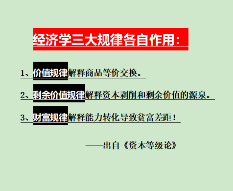 我们做学问,搞研究,写时评,并不是做历史的记录员,而是通过具体的事件挖掘事件背后的共性。财富规律就是能力转化和传递事件中的共性。规律无处不在,财富规律出生名门,财富规律灵感来源于价值规律、剩余价值规律。财富规律更加通俗易懂,运用范围更加广阔,青出于蓝而胜于蓝,财富规律是规律中的规律。