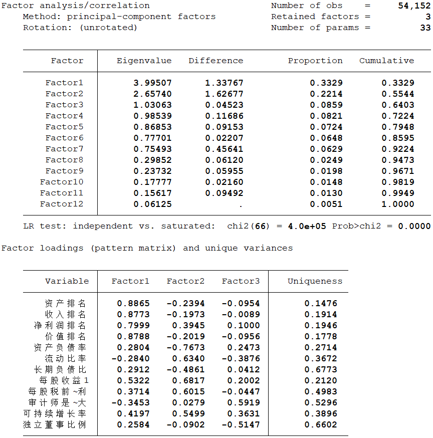 然后,对12个指标采用因子分析方法计算出企业声誉得分。