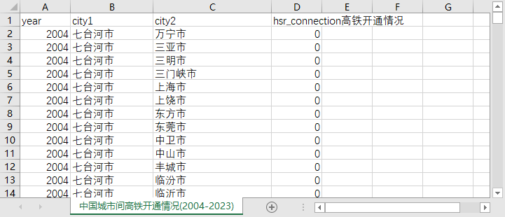 该数据集完整记录了2004-2023年全国城市间高铁开通动态,为高铁经济效应研究提供基础数据支撑,可精准评估交通网络建设对区域经济、人口流动和产业升级的影响,助力城市群发展战略制定与交通资源配置优化。