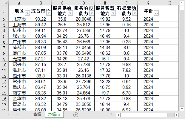 数据指标:地区、年份、总分、服务供给能力指标、服务响应能力指标、服务智慧能力指标(商品图有展示)