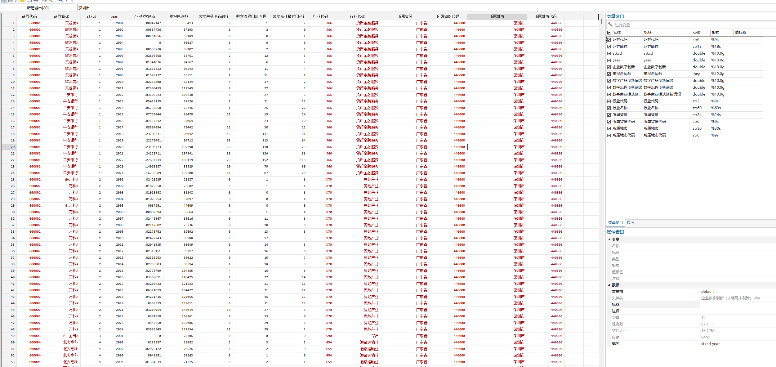 处理说明:原始数据为使用Python对上市公司年报进行文本分析后获得(jieba分词,停用词表使用哈工大停用词表),后续使用Stata进行整理,最终形成面板数据