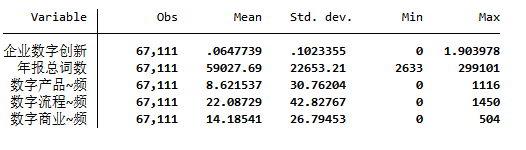 【测度企业数字创新】本文对企业年报中关于数字创新的关键词进行抓取,将数字产品创新、数字流程创新、数字商业模式创新,三个维度词频之和占年报全文总词数比重作为企业的整体数字创新,为了避免数据量纲过小,对该指标作出乘以100的处理。