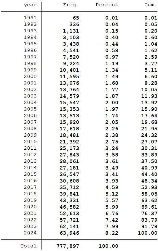 样本选择:全部A股1991-2024年数据(初始数据是从1990年开始,经过处理后的数据起点为1991年)