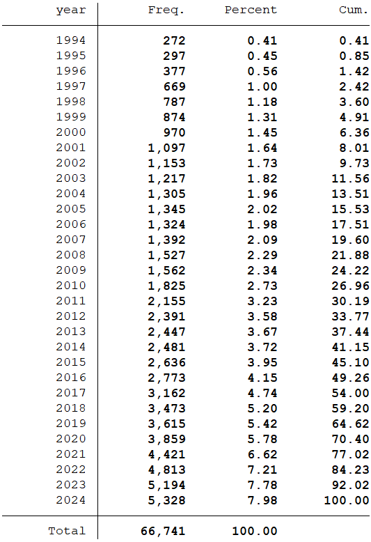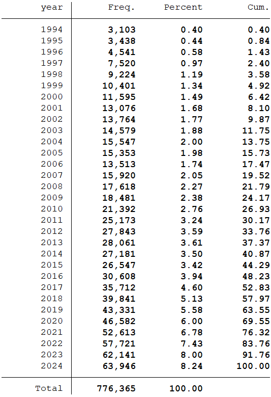 样本选择:全部A股1994-2024年数据(“五因子模型指标日”在数据库中是从1994-01-03开始,所以数据起点为1994年)