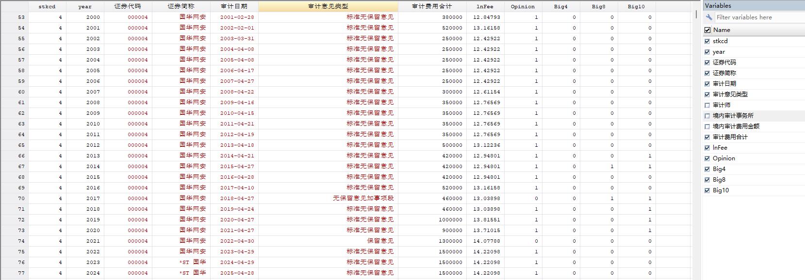 是否八大(Big8)、是否十大(Big10):如果境内审计事务所评比得分或收入排名当年前八名或前十名则取值为1,否则为0(根据中注协百强数据判断) 由于中注协目前只公布到2023年,所以2024年也以2023年为标准。