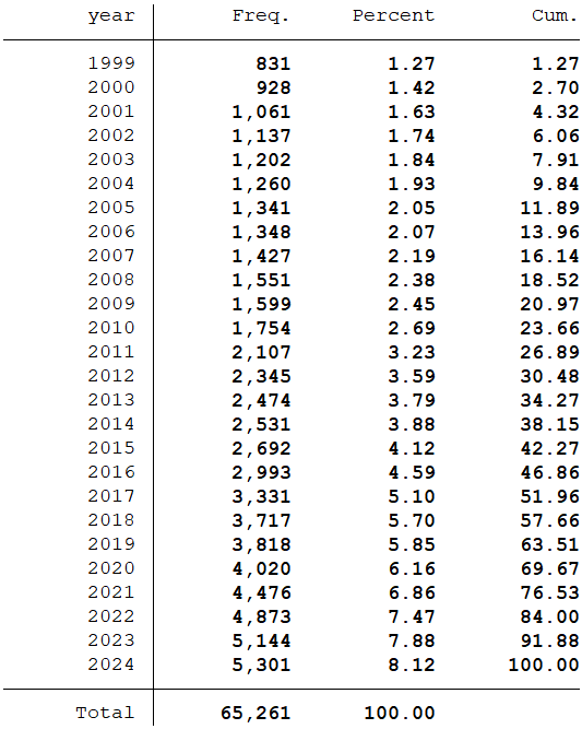 样本选择:全部A股1999-2024年数据(“研发支出”在数据库中是从1998年开始,公式中用到了滞后一期的变量,所以会造成缺失一年的数据,经过处理之后的数据起点为1999年)