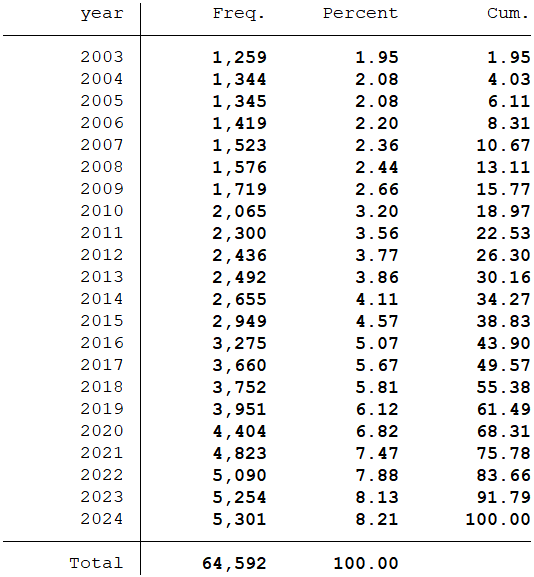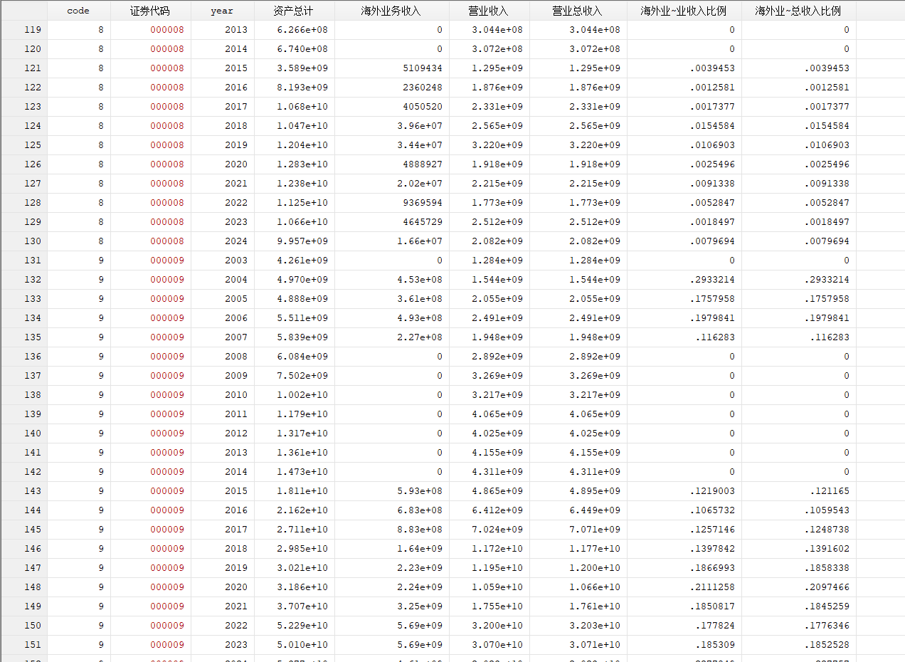 样本选择:全部A股2003-2024年数据(“海外业务收入”在数据库中的初始数据是从2003年开始,所以数据起点选择为2003年)
