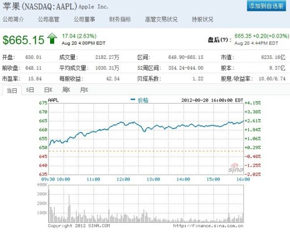 当日,苹果股价上涨17.04美元,报收于665.15美元,涨幅为2.63%,创下公司自身的股价新高,按此计算公司市值为6235.2亿美元,打破微软在1999年创下的6205.8亿美元的历史纪录;过去52周,苹果最高价为665.15美元,最低价为354.2美元。这一对比并未考虑通胀因素;经通胀调整后,微软市值在1999年12月30日触及的历史最高市值约为8500亿美元。微软当前的市值为2570亿美元。