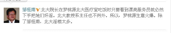 8月21日,上午9点20左右,北京大学教授邹恒甫实名新浪微博上发表一段内容,“北大院长在梦桃源北大医疗室吃饭时只要看到漂亮服务员就必然下手把她们奸淫。北大教授系主任也不例外。所以,梦桃源生意火爆。除了邹恒甫,北大淫棍太多。”