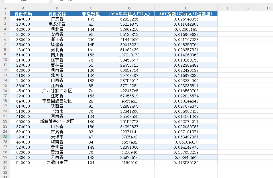 省份代码 | 省份名称 | 非遗数量 | 1990年常住人口(人) | 高管艺术暴露指数(每万人非遗数量) |
