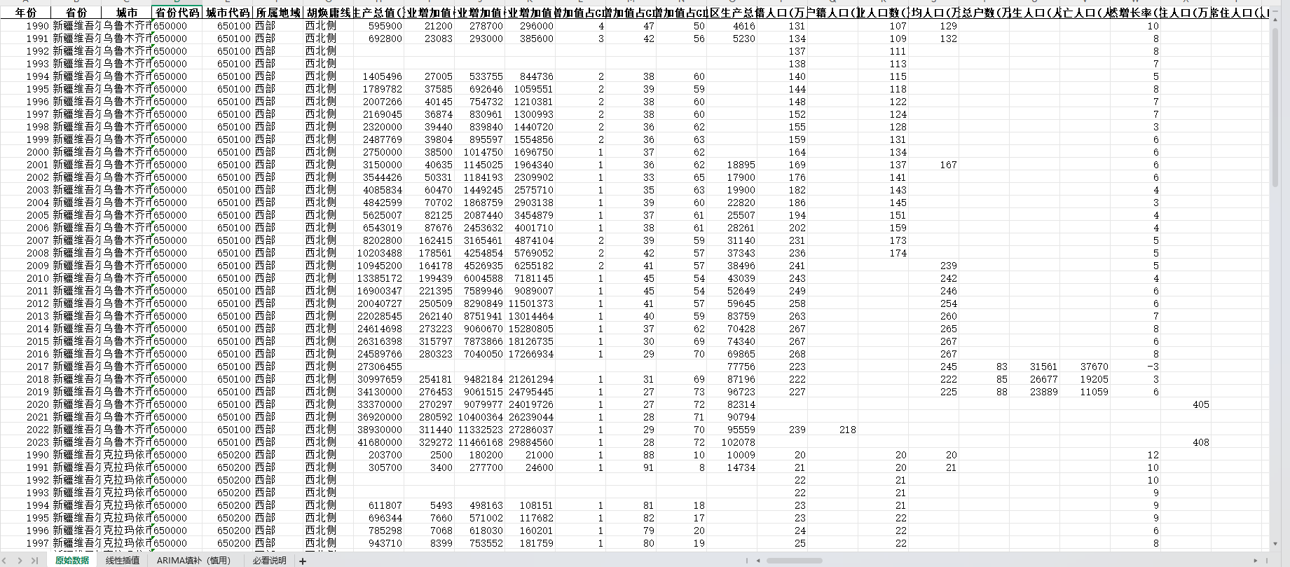 中国地级市面板统计数据库(包含四个页签:原始数据、线性插值、ARIMA填补、有效统计值四个页签)