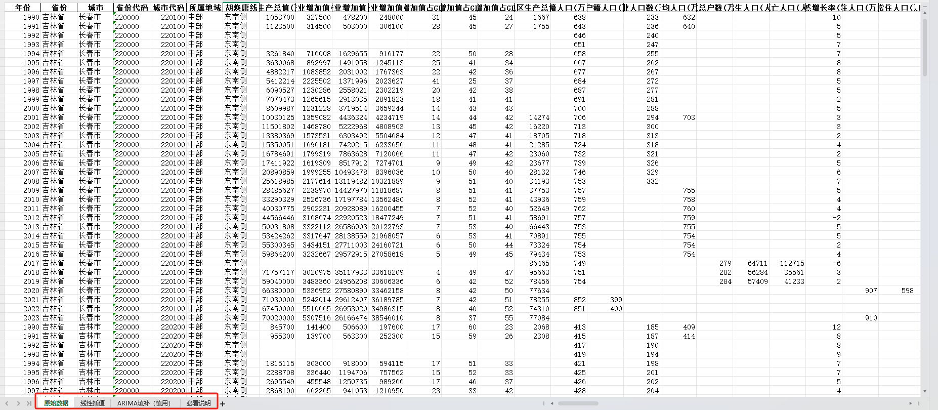 中国地级市面板统计数据库(包含四个页签:原始数据、线性插值、ARIMA填补、有效统计值四个页签)