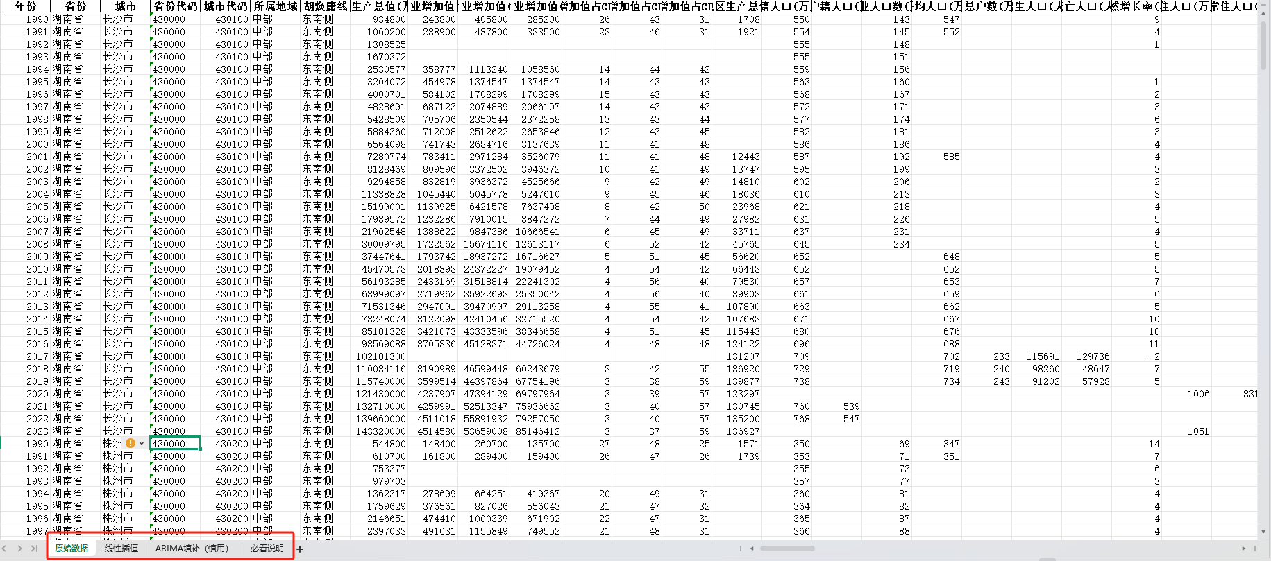 中国地级市面板统计数据库(包含四个页签:原始数据、线性插值、ARIMA填补、有效统计值四个页签)