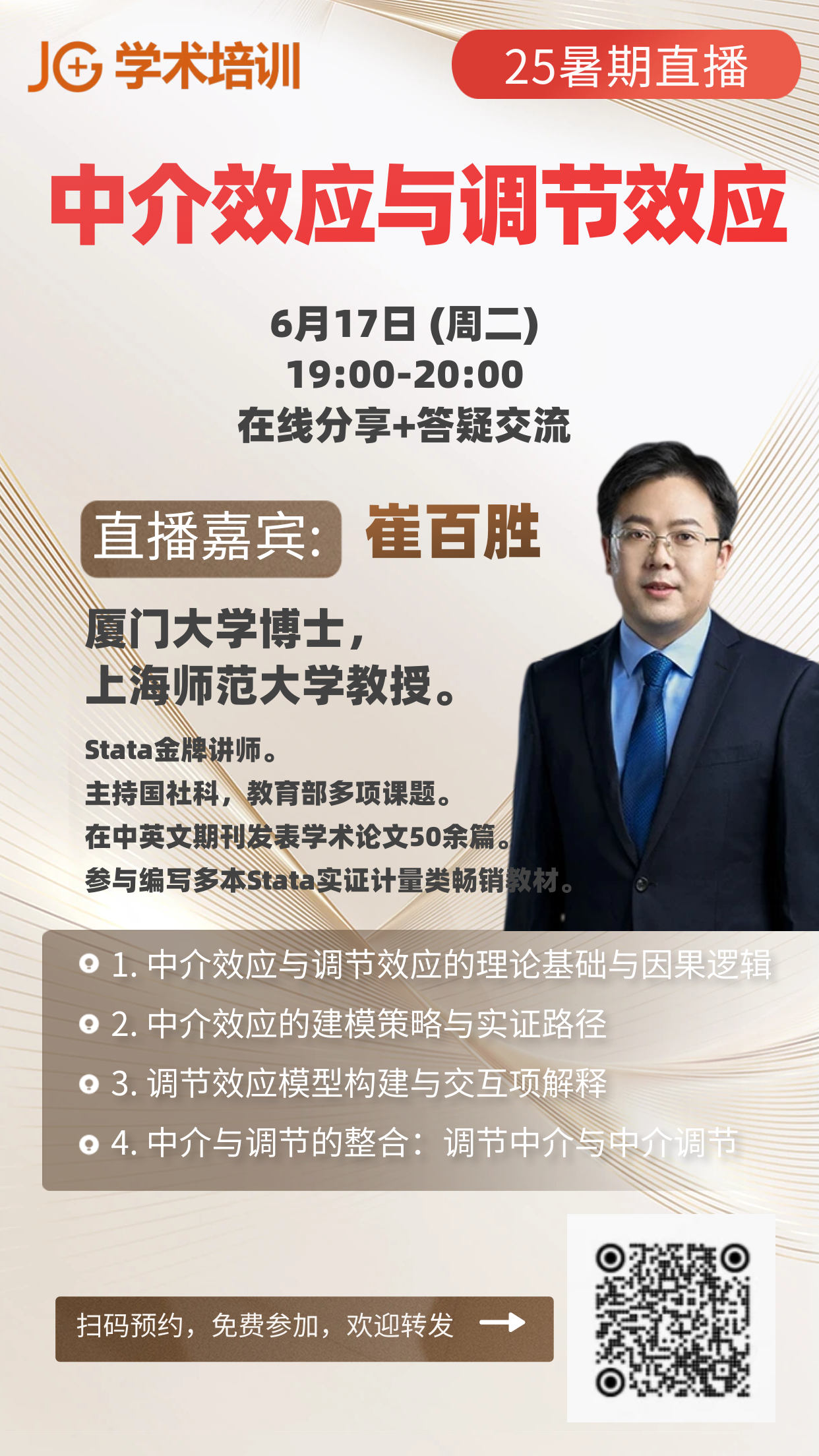 JG学术培训暑期大咖系列直播特邀厦门大学经济学博士、上海师范大学教授崔百胜老师今晚为大家带来“中介效应与调节效应”的直播。
