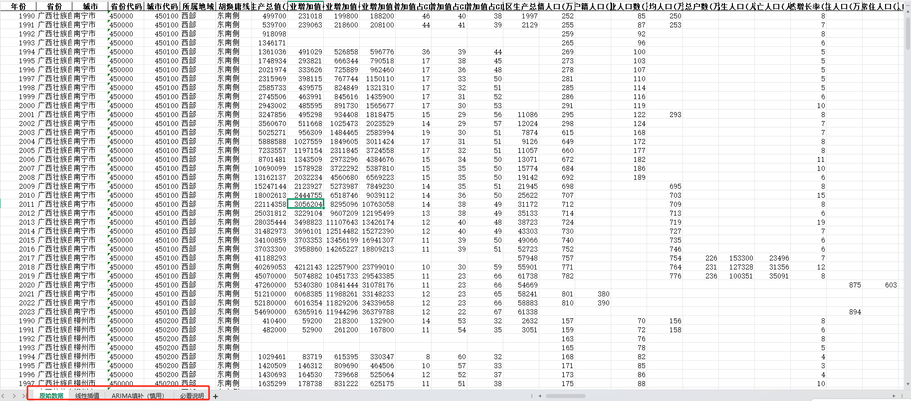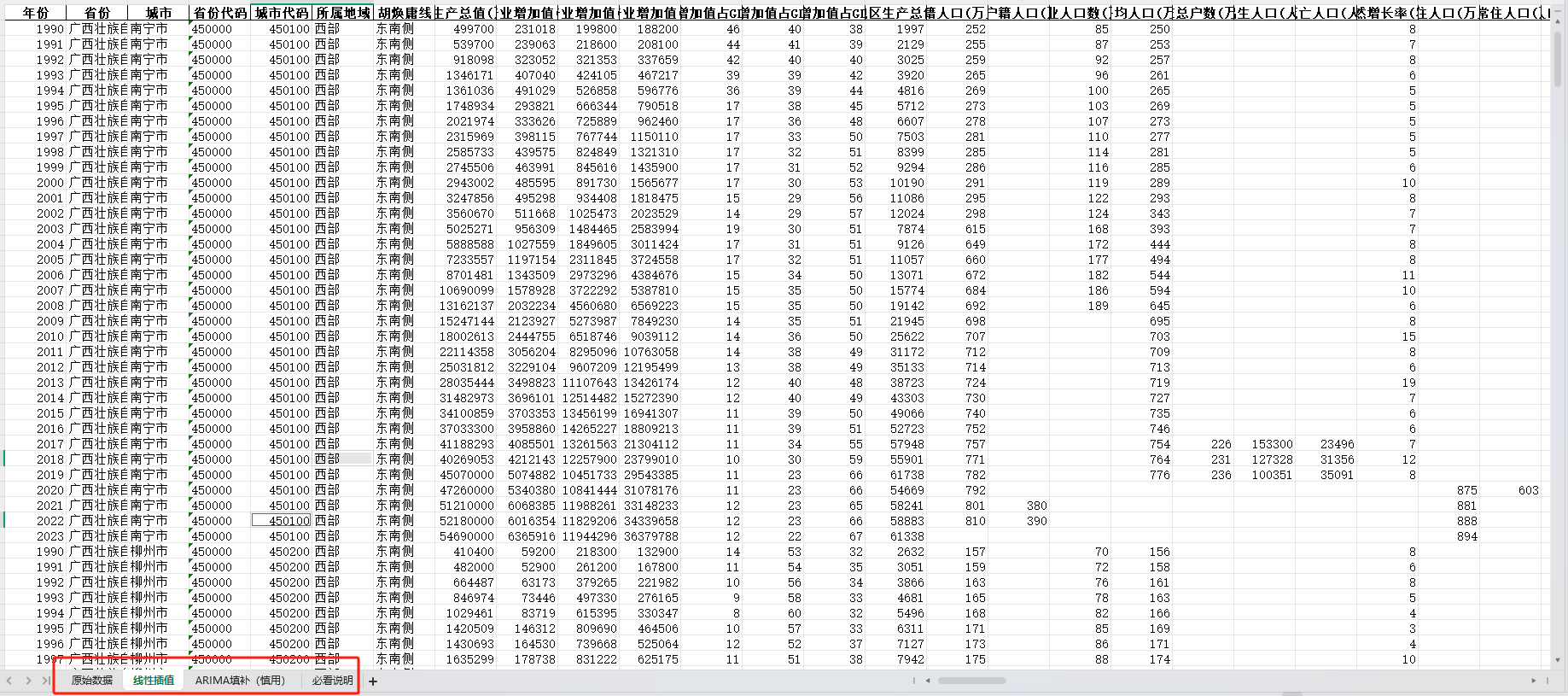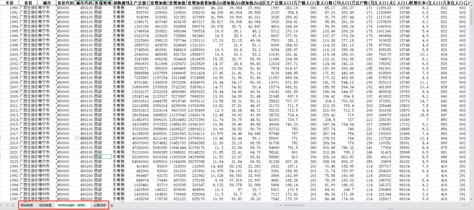 中国地级市面板统计数据库(包含四个页签:原始数据、线性插值、ARIMA填补、有效统计值四个页签)