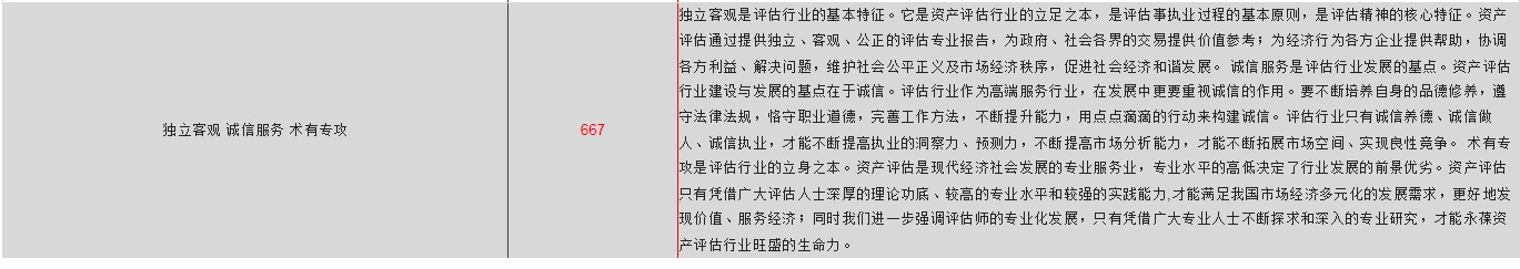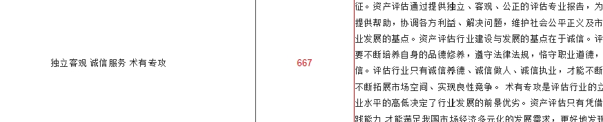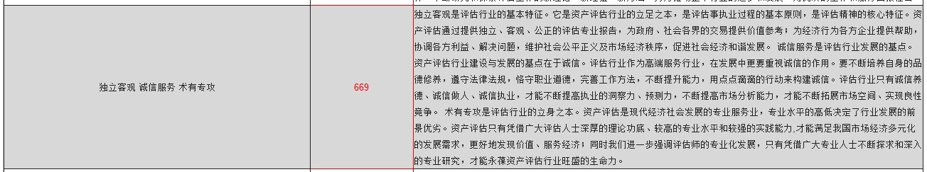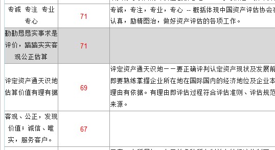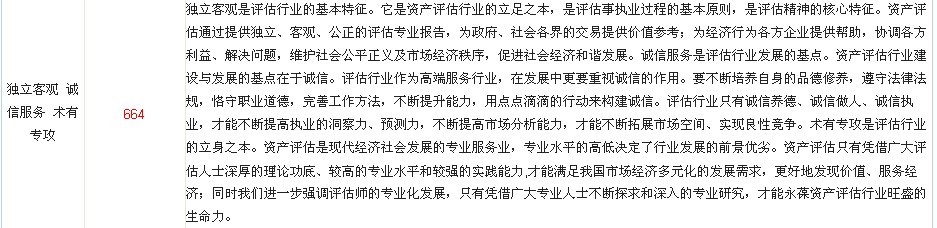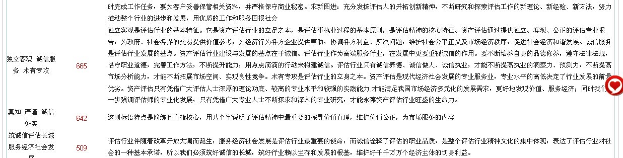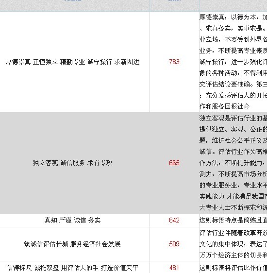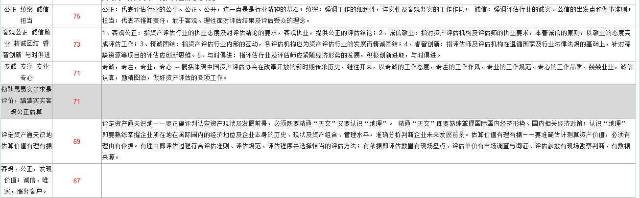 厚德崇真 正恒独立 精勤专业 诚守操行 求新图进 778 厚德崇真:以德为本,加强职业道德的修养,诚实正直,勤勉尽责,努力提高评估人的思想、行为品格;尊崇真理,以实为真,以法为据、求真务实,实事求是。正恒独立:恪守独立、客观、公正原则,长期保持评估行为的独立性,评估人在开展资产评估工作中务必坚持职业立场,不要受到外界各种因素的影响,要确保评估行为和评估结论客观、真实、公正、公平。精勤专业:评估人要努力学习业务,钻研业务,不断提高专业素质和工作能力。同时,对待工作的态度要认真,对待所承担的任务要负责。所完成工作务必讲求质量,精益求精。诚守操行:进一步强化评估人的职业操守,努力树立评估人的职业形象。首先要遵纪守法,不得从事与评估人身份不符或可能损害职业形象的各种活动,不得利用执业便利为自己或他人谋取不正当利益。其次要遵守行业规范,获取业务方式要正当,使用评估方法要正确,提交评估结论要准确。第三,要讲求信用,必须按照约定及时完成工作任务,要为客户妥善保管相关资料,并严格保守商业秘密。求新图进:充分发扬评估人的开拓创新精神,不断研究和探索评估工作的新理论、新经验、新方法,努力推动整个行业的进步和发展,用优质的工作和服务回报社会