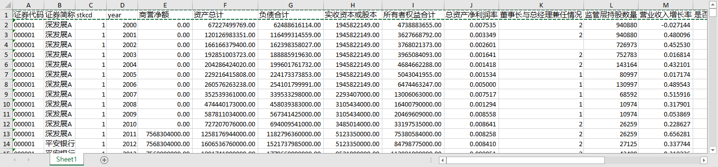 证券代码 证券简称 stkcd year 商誉净额 资产总计 负债合计 实收资本或股本 所有者权益合计 总资产净利润率 董事长与总经理兼任情况 监管层持股数量 营业收入增长率 是否现金支付 买方支出价值 上市日期 公司成立日期 市场类型 行业代码 行业名称 所属省份 所属省份代码 所属城市 所属城市代码