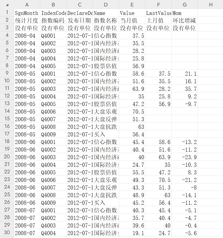 IndexCode [指数编码] - Q4001信心指数;Q4002国内经济基本面;Q4003国内经济政策;Q4004国际经济金融环境;Q4005股票估值;Q4006大盘乐观;Q4007大盘反弹;Q4008大盘抗跌;Q4009买入;